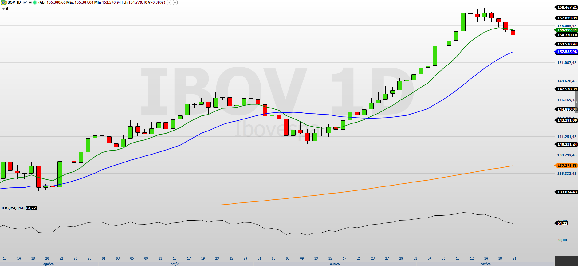 No curto prazo, observo que o Ibovespa (IBOV) entrou em um movimento de correção depois de registrar a máxima histórica em 158.467 pontos. Pelo gráfico diário, ficou lateralizado logo após o topo e, na sequência, iniciou um movimento de baixa que rompeu a média de 9 períodos. Agora, o preço se aproxima da média de 21 períodos — e a perda dessa faixa pode abrir espaço para correções mais amplas. Neste momento, o índice negocia entre as médias curtas, o que reforça um cenário de neutralidade temporária.